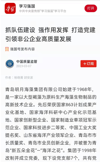 青島明月海藻集團黨建工作獲“學(xué)習(xí)強國”平臺報道