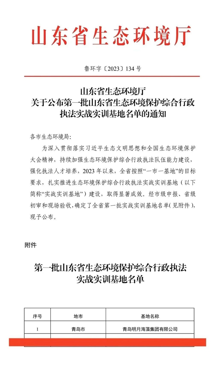 日前,青島明月海藻集團被山東省生態(tài)環(huán)境廳授予“首批山東省生態(tài)環(huán)境保護綜合行政執(zhí)法實戰(zhàn)實訓基地”。