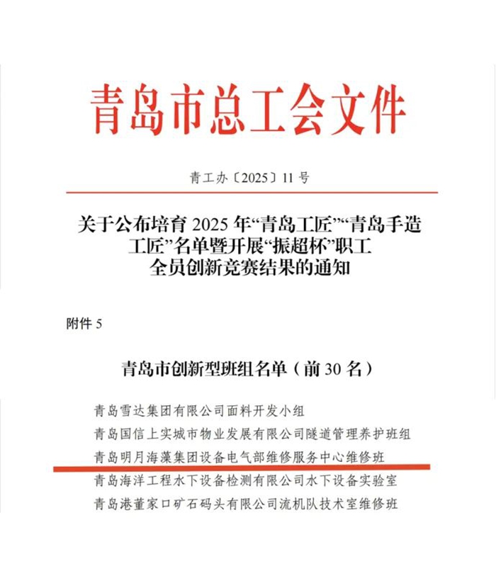 日前,青島市總工會(huì)發(fā)布《關(guān)于公布培育2025年“青島工匠”“青島手造工匠”名單暨“振超杯”職工全員創(chuàng)新競(jìng)賽結(jié)果的通知》。在評(píng)選出的30個(gè)“青島市創(chuàng)新型班組”中,明月海藻集團(tuán)設(shè)備電氣部維修服務(wù)中心維修班憑借卓越的創(chuàng)新實(shí)踐能力成功入選,榮膺該稱號(hào)!